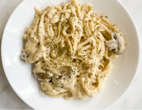 This delicious white wine sauce is made with cashews, white wine, garlic, shallots, organic vegetable broth, lemon and spices, tossed with organic mushrooms, organic spinach and organic pasta