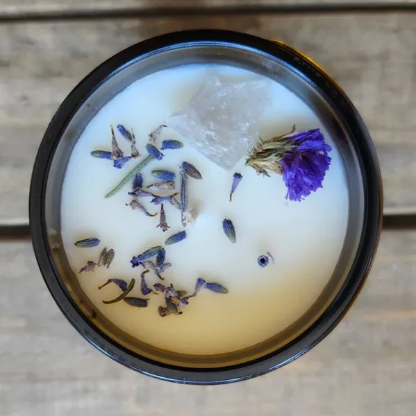 Each candle is dressed with lavender, statice, and rough smoky quartz crystals for grounding and peace.
